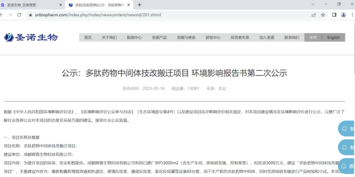 本項目在圣諾生物官網(wǎng)上進(jìn)行了征求意見稿網(wǎng)絡(luò)公示,時間為2023年5月16日~2023年5月30日(10個工作日)。圣諾生物官網(wǎng)為對外公開,易于公眾接觸及閱讀的網(wǎng)站。公示信息的網(wǎng)址為: