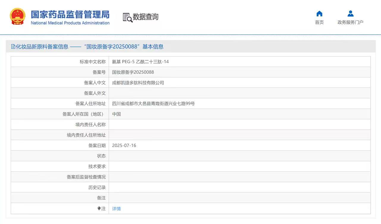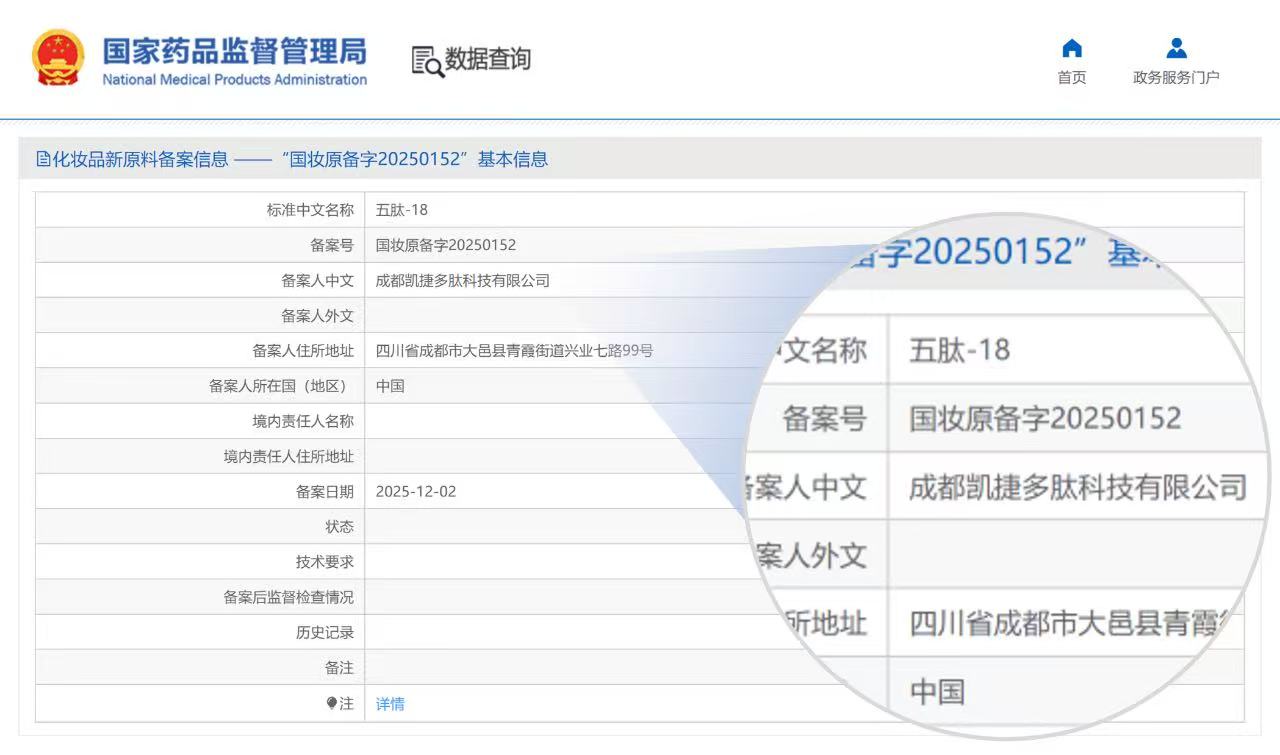 12月2日,圣諾生物化妝品新原料“五肽-18”(國妝原備字20250152)正式通過國家藥監(jiān)局備案!目前,圣諾生物全資子公司-成都凱捷多肽科技有限公司共成功備案了4款多肽新原料。